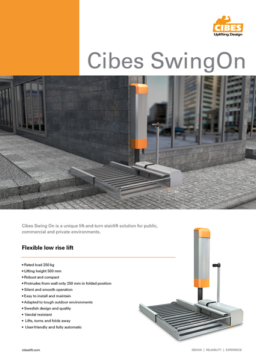 Le monte-marche Cibes SwingOn est une solution d’accessibilité flexible et discrète. Son plateau assure une mobilité verticale jusqu’à 50 cm de course par rotation et sans bloquer le passage.